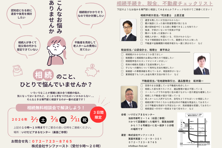 2月7日(土)、8日(日)、11日(祝)の3日間限定で、いけだピアまるセンターにおいて相続無料相談会を開催します!
